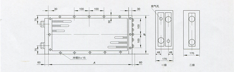 UⅡ型散熱排管為半回路(一排)或雙回路(二排)的空氣熱交換器,可加熱或冷卻空氣。其肋片管繞制完畢后,需進行表面浸鍍錫合金,以使肋片與管子接觸緊密堅固,達到美觀防腐的作用,結構特性見下表。